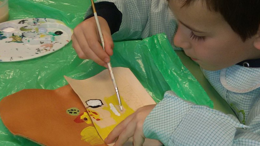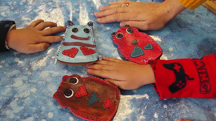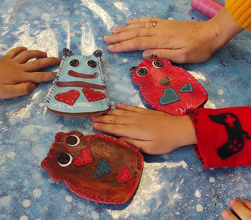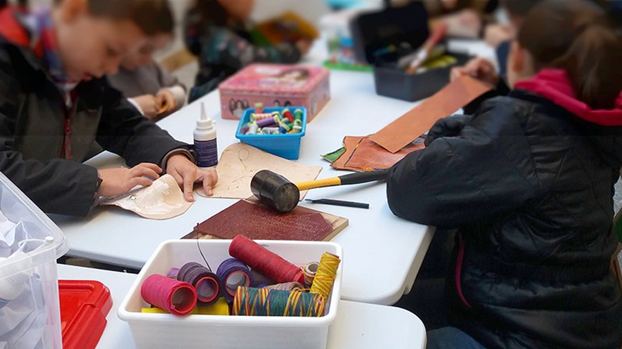 Durante el curso escolar se dan talleres de cuero a niños a partir de 5 años hasta un máximo de 18 años. Se realizan piezas de piel con las técnicas decorativas y específicas de este tipo de disciplina, elevándolo a ser un taller de artesanía y no solo una manualidad. En estos talleres lo que más se valora es el proceso creativo e imaginativo del niño. A lo largo de estos años la experiencia de trabajar con niños, me ha hecho ver lo positivo de este tipo de actividad, por las grandes aportaciones que conlleva. El manejo independiente de las herramientas, la destreza manual de cada niño y la imaginación de cada uno de ellos, hace que mejoren en autoestima, psicomotricidad fina, confianza,seguridad en sí mismos y que no pierdan la capacidad de ser creativos a la hora de resolver cualquier problema en su vida.